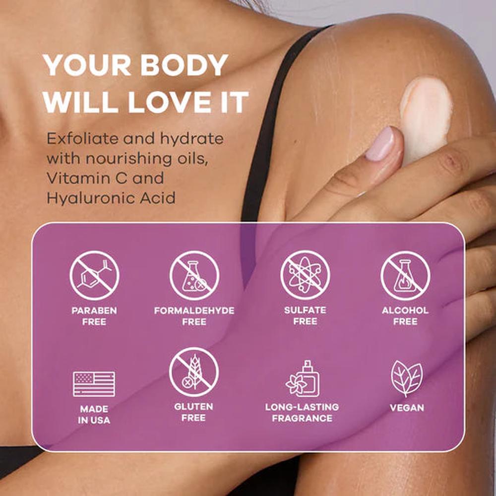 The scrub earns repeat purchases because the difference is immediate. After one shower, skin feels softer and looks more luminous. Over time—especially when paired with an exfoliating mitt—rough areas appear smoother, body lotion applies more evenly, and self-tanner or bronzer lays down streak-free. Clients tell us they notice fewer flakes on dark clothing, less ashiness on legs and arms, and a healthier-looking sheen on bare skin.