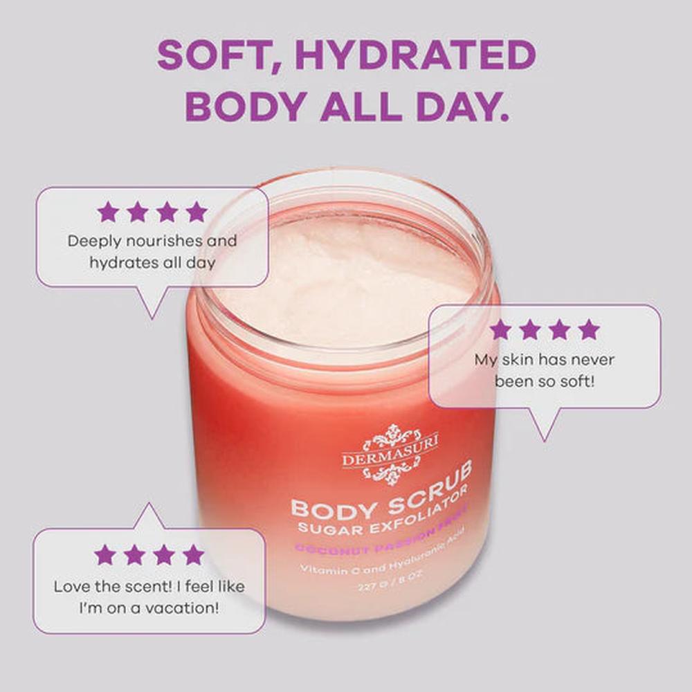 Dermasuri Body Scrub Sugar Exfoliator — 8 oz. Silky-soft, touchably smooth skin starts in the shower. This sugar-based body polish gently lifts dull, dry buildup while flooding skin with conditioning oils and butters, so your clients (and you) step out with a hydrated glow—not a tight, stripped feel. Fine sugar crystals melt as you massage, refining rough spots on elbows, knees, and feet and leaving the whole body noticeably brighter, smoother, and more even to the touch.