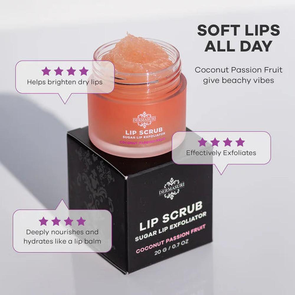 Dermasuri Lip Scrub Sugar Exfoliator — Coconut Passionfruit, 0.7 oz. Soft, pillowy lips start with a smooth canvas. This sugar-based lip polish gently lifts flaky buildup while a cushiony blend of plant oils and butters drenches delicate skin in moisture. The result is instantly smoother lips with a healthy-looking sheen—perfect for effortless balm days and a crease-free lipstick finish.
