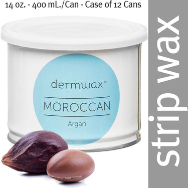 Dermwax Moroccan - Argan Wax / Strip Wax / 14 oz. - 400 mL. per Can - Case of 12 Cans by DermWax. Moroccan - Argan is an all-purpose strip wax, infused with Argan oil derived from the Moroccan Argan tree. Argan Oil naturally hydrates skin and turns skin to silk. Formulated for sensitive skin for use on on all body parts for easy removal of coarse to medium hair. Strip wax is our most popular type of wax. Exclusively manufactured and packaged in Europe. This wax is applied thin and removed with strips. It leaves no residue on the skin and is formulated with the best and latest ingredients to effectively remove all hair in one easy application. Case of (12) 14 oz. Cans.