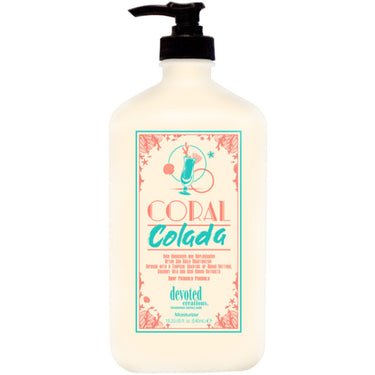 Devoted Creations Coral Colada Moisturizer / 18.25 fl. oz. - 540 mL. Devoted Creations Coral Colada Replenishing Daily Moisturizer is made with super softening Monoi Butter antioxidants and a vitamin rich blend of Green Tea and Sea Salt detoxifiers. This moisturizer is Aloe Vera based for 24 Hour Moisture! Sensitive Skin formula.