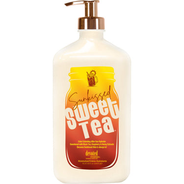 Devoted Creations Sunkissed Sweet Tea Moisturizer / 18.25 fl. oz. - 540 mL. Formulated for those with a soul full of sunshine. Allow your skin to bask in Sunkissed Sweet Tea's juicy hydration, while added color quenching bronzers work to maintain your summer tan! Infused with antioxidant loaded Black Tea, humectants, hydration essential Honey, and electrolyte rich Raspberry to ensure your skin is sipping' on only the most nourishing vitamins and minerals. It doesn't matter if you're catching rays or making waves, it's time to shower your skin in sunshine with Sunkissed Sweet Tea, your new bronzing brew!