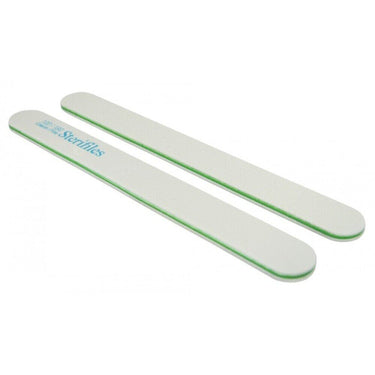 Disinfectable Sterifiles Nail Files - 100/180 Mylar - Lime Center / 50 Count. Sterifiles 100/180 (Lime Center) disinfectable nail files are specially designed for professionals or home use to buff and shape all types of nails. Sterifiles are made of durable resin coated polyester backed abrasives bonded to a closed cell foam that does not absorb moisture and can be soaked in a disinfectant bath for hours.
