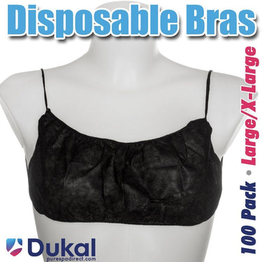Disposable Single Use Bra - BLACK / Large-XL / 100 Pack - Individually Wrapped Bras by Dukal. These single-use bras provide comfort with just the right amount of coverage. They're made of soft spun bonded polypropylene material and feature elastic straps that fit around the shoulders. Latex-free. Individually wrapped. 100-count bag.
