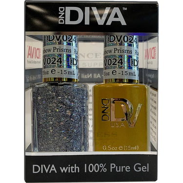 DND Diva Duo Gel - #024 - Rainbow Prism / Soak-Off Gel Polish 0.5 oz. + Nail Lacquer 0.5 oz. Enhance your nail service offerings with the DND Diva Duo Gel, a perfect combination of soak-off gel polish and matching nail lacquer that delivers long-lasting, vibrant results. This duo set is designed for professionals who want to provide their clients with the flexibility of a durable gel manicure alongside the convenience of traditional lacquer. With superior coverage, rich pigmentation, and a chip-resistant finish, the DND Diva Duo ensures that your clients' nails stay flawless for weeks.