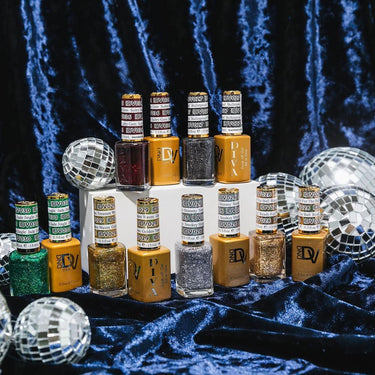 DND Diva Duo Mirrorball 36 Colors of Soak-Off Gel Polish 0.5 oz. + Nail Lacquer 0.5 oz. #182-#218. Elevate your salon's nail services with the dazzling DND Diva Duo Mirrorball Collection. This stunning set of 36 colors is designed to bring sparkle and glamour to every manicure. Each duo includes a matching gel polish and nail lacquer, providing your clients with a cohesive and long-lasting finish. The advanced Daisy Gel Nail Polish formula eliminates the need for a base coat and bond, streamlining the application process and ensuring a flawless result every time. Perfect for creating show-stopping looks that last up to 21 days, this collection is a must-have for any professional salon.