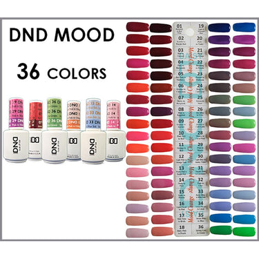 DND Mood Changing Gel 0.5 oz. Each / Set - 36 Colors. Elevate your nail art offerings with the DND Mood Changing Gel set, featuring 36 stunning shades that transform with temperature changes. This comprehensive collection is designed for professionals who want to provide their clients with a unique and interactive manicure experience. Each color in this set shifts beautifully between hues, creating a dynamic and ever-changing look that will captivate your clients. Whether they're in a cool or warm environment, these gels offer a playful and sophisticated touch that enhances any style.