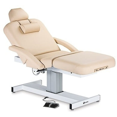 Everest Electric Salon Massage Table. The UL approved Everest Salon offers resort spa treatment functionality and comfort in a minimalist package. An ideal choice for day spas, medi-spas and resorts, the sleek single pedestal Everest maximizes leg and knee room giving therapists much needed client access while maintaining exceptional strength and stability. The reliable electric lift actuator provides smooth and quiet height adjustments with an easy to use foot pedal.