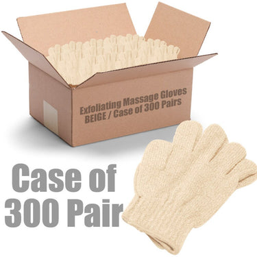 Exfoliating Massage Gloves - BEIGE / Case of 300 Pairs. Exfoliating Massage Gloves are a must-have tool for any professional spa or salon, offering an efficient way to provide clients with deeply exfoliated, refreshed skin. These gloves, sold in a bulk case of 300 pairs, are ideal for high-demand environments, ensuring you always have an abundant supply for your clients. The natural beige color is versatile, providing a clean and inviting aesthetic for any treatment room. Perfect for improving circulation and enhancing overall skin tone, these gloves allow for superior exfoliation in a variety of treatment settings.