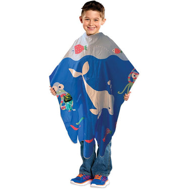 Extra Long Kiddie Cape / 35" x 51". 100% premium polyester cape features a fun, colorful underwater pattern. Oversized design is perfect for complete coverage and can accommodate growing young clients. Lightweight cape is water resistant, static-free and machine washable.