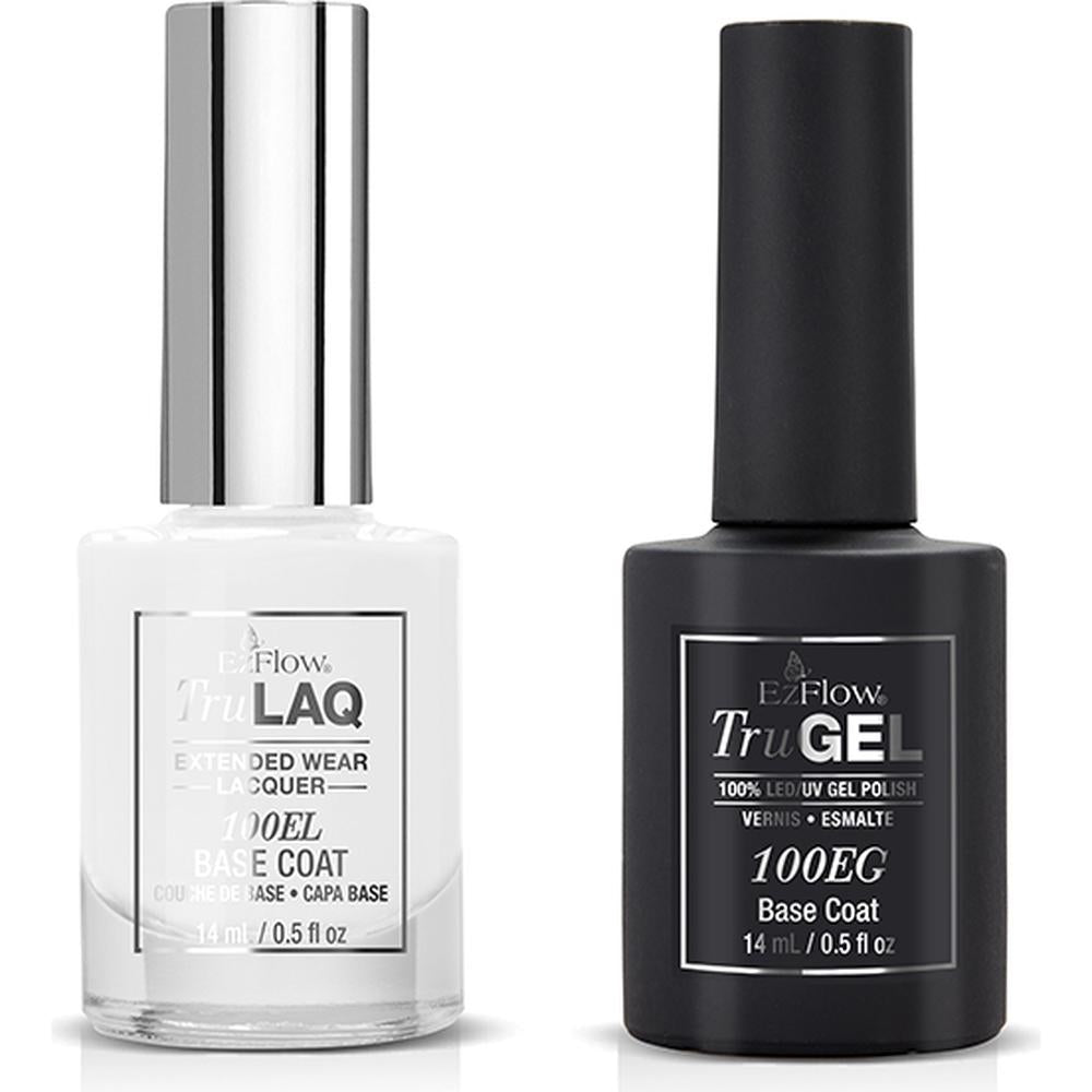 Elevate Your Nail Game with Ez FlowTru Match Base Coat Duos. Are you tired of base coats that chip away your confidence along with your polish? Say goodbye to subpar nail prep and hello to perfection with Ez FlowTru Match Base Coat Duos. Crafted with the expertise of salon professionals in mind, our Tru Laq Base Coat, fortified with calcium and vitamin E, delivers not just a flawless foundation but also a boost of nourishment to your nails.