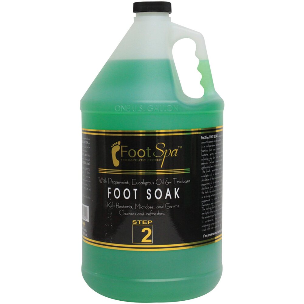 Foot Soak / 1 Gallon. Foot Soak. The second step in a pedicure, the triclosan-based antibacterial high foaming foot soap kills bateria, germs and microbes while still softening dry skin. Contains peppermint, eucalyptus oil and tricolas that together acts as an anti-inflammatory, muscle relaxent and helps to relieve tired, stiff, sore muscles and joints.