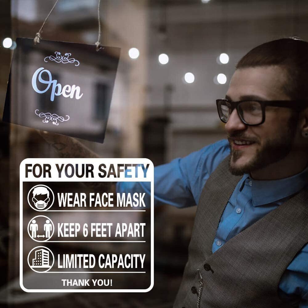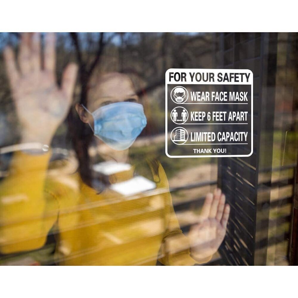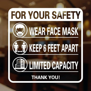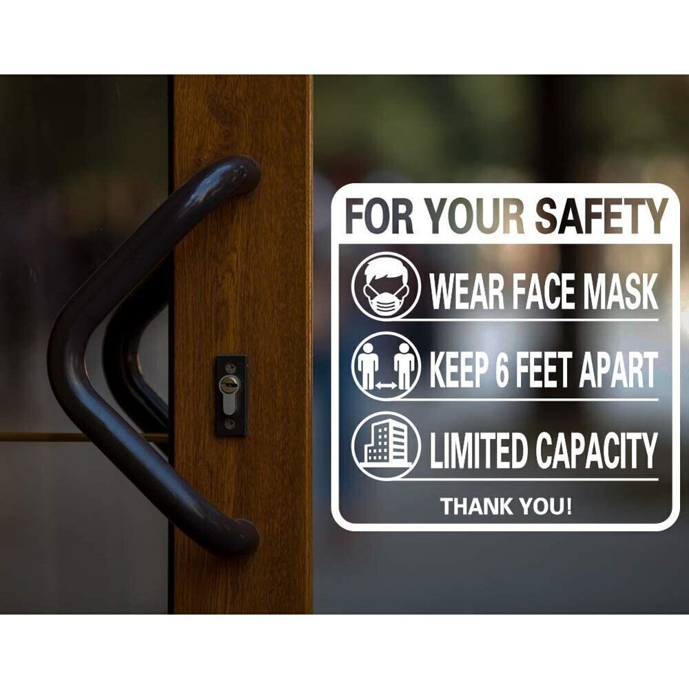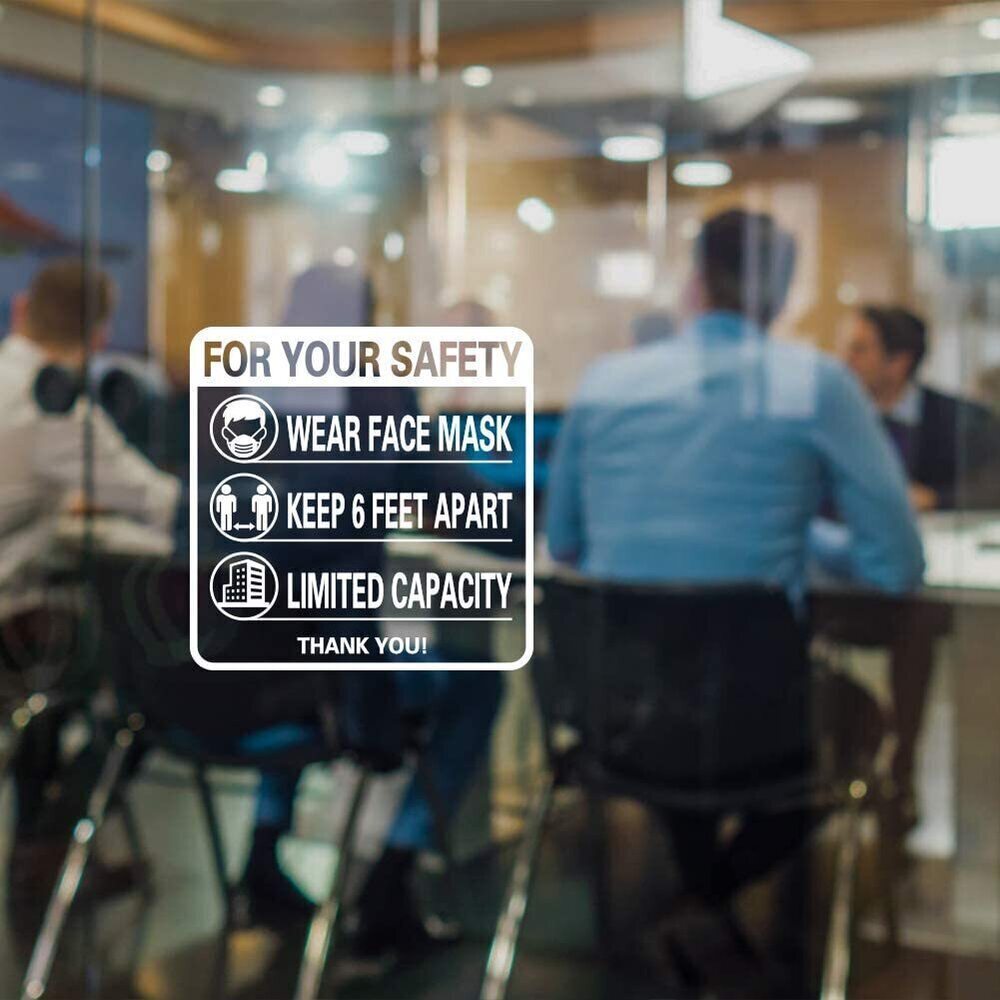• FACE MASK SOCIAL DISTANCE WINDOW DECAL: For Your Safety Wear Face Mask + Keep 6 Feet Apart + Limited Capacity in 9.8" square.