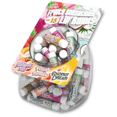 Fruit Scentsations Lip Balm Fish Bowl / 24 Lip Balms - (8) Raspberry Rush + (8) Peach Paradise + (8) Coconut Dream. Fruit Scentsations Lip Balm Fish Bowl Display Includes 8 lip balms each of: Raspberry Rush, Peach Paradise, and Coconut Dream.