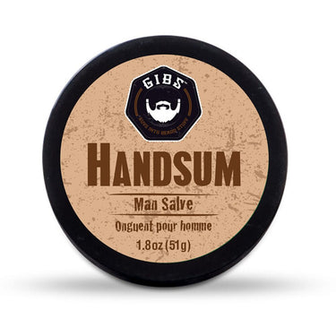 GIBS Handsum Man Salve / 1.8 oz. - 51 grams. Man Salve - for hands and any dry areas. A Gibs guy reaches for a salve that works as hard as he does. Handsum Man Salve erects a barrier of protection and moisture, repaving and repairing dry, cracked skin with a blend of hemp, safflower, sapote and karanja oils. Coconut oil and beeswax help to protect against the elements. Get a grip on cracked, callused skin! Handsum Man Salve not only provides moisture and conditioning for your skin but protects it too!