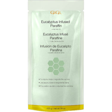 GiGi Eucalyptus + Tea Tree Oil Paraffin Wax / 16 oz. Bring the essence of a calming spa experience to your professional treatments with GiGi's Eucalyptus + Tea Tree Oil Paraffin Wax. This expertly infused paraffin is designed to provide luxurious, soothing care for your clients while offering skin-nourishing benefits. Its unique blend of eucalyptus and tea tree oil not only hydrates the skin but also envelops the senses in a delightful aroma that relaxes the mind and body.