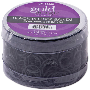 Gold Magic 500 Black Rubber Bands In A Container. Enhance your salon's styling with the Gold Magic 500 Black Rubber Bands! These black rubber bands come in a reusable container, and with 500 bands per container, you'll have plenty for all of your styling needs. Whether you're creating intricate updos or simply need to secure a ponytail, these durable rubber bands provide the hold you need to keep your styles in place.