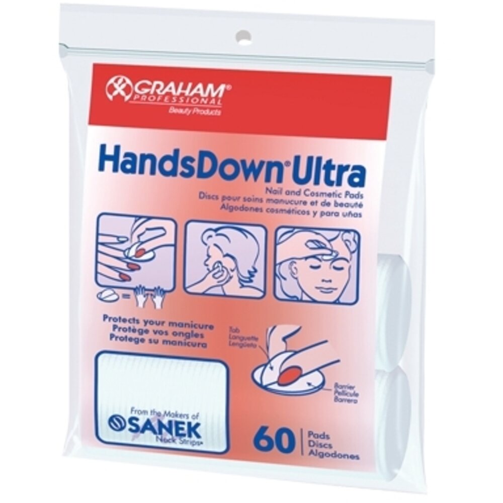 Graham Handsdown Ultra Nail/Cosmetic Pads - 60 per Bag. Graham Handsdown Ultra Nail/Cosmetic Pads / 60 per Bag / 24 Bag Case. Just one HANDSDOWN ® lint-free pad removes polish from all ten nails without damaging a technician's own manicure. A poly tab allows for the pad to be held securely between thumb and forefinger while preventing fingers from coming in contact with polish remover. Versatile: also cleans around hairline after color, applies cleansers and blush, and applies or removes makeup.