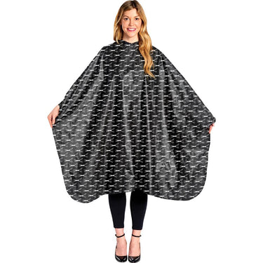 Haircutting Cape - 100% Polyester/Nylon Blend by Scalpmaster. Enhance your salon's efficiency and client experience with the Haircutting Cape by Scalpmaster, designed to provide both protection and style during any hair service. This cape is made from a durable blend of polyester and nylon, ensuring that it is lightweight yet strong enough to withstand the rigors of daily use in a busy salon. Its sleek black design, adorned with a playful scissor print, adds a professional yet fun element to your salon environment, making it perfect for both routine haircuts and special styling sessions.