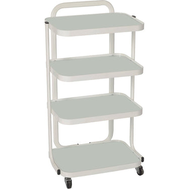 Harley Trolly Cart with Metal Frame + 4 Glass Shelves. The Harley Trolly Cart is a must-have for any esthetician looking for a sleek and functional storage solution. With its minimalist design and white metal frame, this trolley is sure to complement any spa or salon decor.