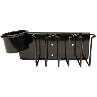 Heat-Resistant Steel Dryer/Clipper Holder With Base. Heat-Resistant Steel Dryer/Clipper Holder With Base. Heat-resistant, multi-purpose steel appliance holder with base. Holds 1 dryer with up to a 2-3/4" Diameter nozzle. Holds 3 clippers with up to a 2-1/2" Diameter. Can sit on a countertop or be mounted to a salon cart, trolley, or wall. Steel construction with black finish. Includes a clamp, Velcro strips, and screws for secure mounting. Dimensions: 14-3/4"W x 4-1/4"H x 4" D. ltems shown in holder not included.