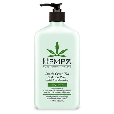 Hempz Green Tea & Asian Pear Moisturizer / 17 oz. - 500 mL. Hempz Exotic Green Tea & Asian Pear Herbal Body Moisturizer is enriched with 100% Pure Natural Hemp Seed Oil and infused with a revitalizing blend of essential extracts. Beneficial Ingredients: Pure Natural Hemp Seed Oil, Green Tea Extract, Pear Extract, Acai Berry Extract, Goji Berry Extract, Vitamins A, C, E & B5. Calms, softens and conditions skin while providing dramatic skin hydration. Essential Extract Blend of Green Tea, Pear, Acai Berry and Goji Berryleaves skin feeling refreshed, revitalized and balanced. Vitamins A, C, E & B5 help protect skin from natural and environmentally triggered oxidants and elements. Assists in leaving skin feeling smoother, firmer and more toned. Helpsstimulate skin with natural anti-inflammatory properties and skin regenerating ingredients. Paraben-Free, Gluten-Free, 100% Vegan. THC-Free.