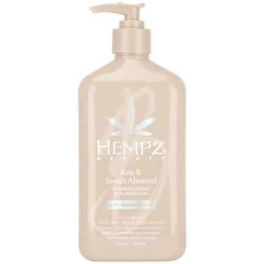 Hempz Koa & Sweet Almond Smoothing Herbal Body Moisturizer / 17 oz. - 500 mL. Light-weight, daily moisturizer absorbs quickly helping to hydrate, soften and smooth. Beauty Blend of essential oils, butters and extracts help restore and seal in moisture. Subtle sweet, perfume notes of Koa and Sweet Almond leave skin refreshed and lightly scented. Enriched with 100% Pure Natural Hemp Seed Oil. Parafen-Free, Gluten-Free, Vegan-Free.