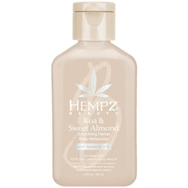 Hempz Koa & Sweet Almond Smoothing Herbal Body Moisturizer / 2.25 oz. - 66 mL. Light-weight, daily moisturizer absorbs quickly helping to hydrate, soften and smooth. Beauty Blend of essential oils, butters and extracts help restore and seal in moisture. Subtle sweet, perfume notes of Koa and Sweet Almond leave skin refreshed and lightly scented. Enriched with 100% Pure Natural Hemp Seed Oil. Parafen-Free, Gluten-Free, Vegan-Free.