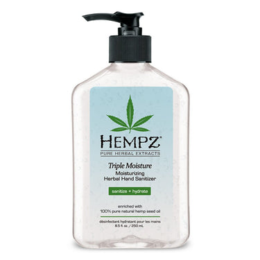 Hempz Triple Moisture Hand Sanitizer / 8.5 fl. oz. - 250 mL. Hempz Travel Size Triple Moisture Moisturizing Hand Sanitizer is an all in one sanitizer and moisturizer that kills 99.99% of most common germs leaving skin soft and hydrated. Lightly scented with refreshing blend of Enchanted Grapefruit and Sparkling Peach our signature sanitizer is enriched with Coconut Oil, Mango Seed Butter and Vitamins A and E to hydrate and condition skin with every application.