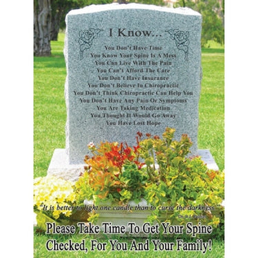 Subluxations kill! The "I Know" poster does attract attention! How many times have you participated at a spinal screening or similar event, when someone walks by your booth or display providing a list of reasons why they don't want to have their spine checked? They typically say this even though they know their health is poor or they are currently in pain. Most patients do not understand the IMPORTANCE of a healthy spine! CHIROPRACTIC (Wellness Care) can save lives! Simply acknowledge the persons comments, and point to the poster or give them the "I know...Handout" (sold separately) with your business card attached. The poster and handout speak for themselves! (Yes. we know they are dramatic...but they do get the point across, which likely will provide an opportunity for Chiropractors to save more lives!) 18" x 24", 3 ml., lamination included.