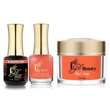 iGel 3-in-1 (GEL + LACQUER + DIP POWDER) - DD29 CORAL BLAZE by iGel. iGel 3-in-1 (GEL + LACQUER + DIP POWDER) - DD29 CORAL BLAZE. iGel Beauty's great 3-in-1 set includes 1 iGel Polish / 0.5 oz. + 1 iLacquer / 0.5 oz. + 1 Dip & Dap Powder / 2 oz. - all in matching colors.