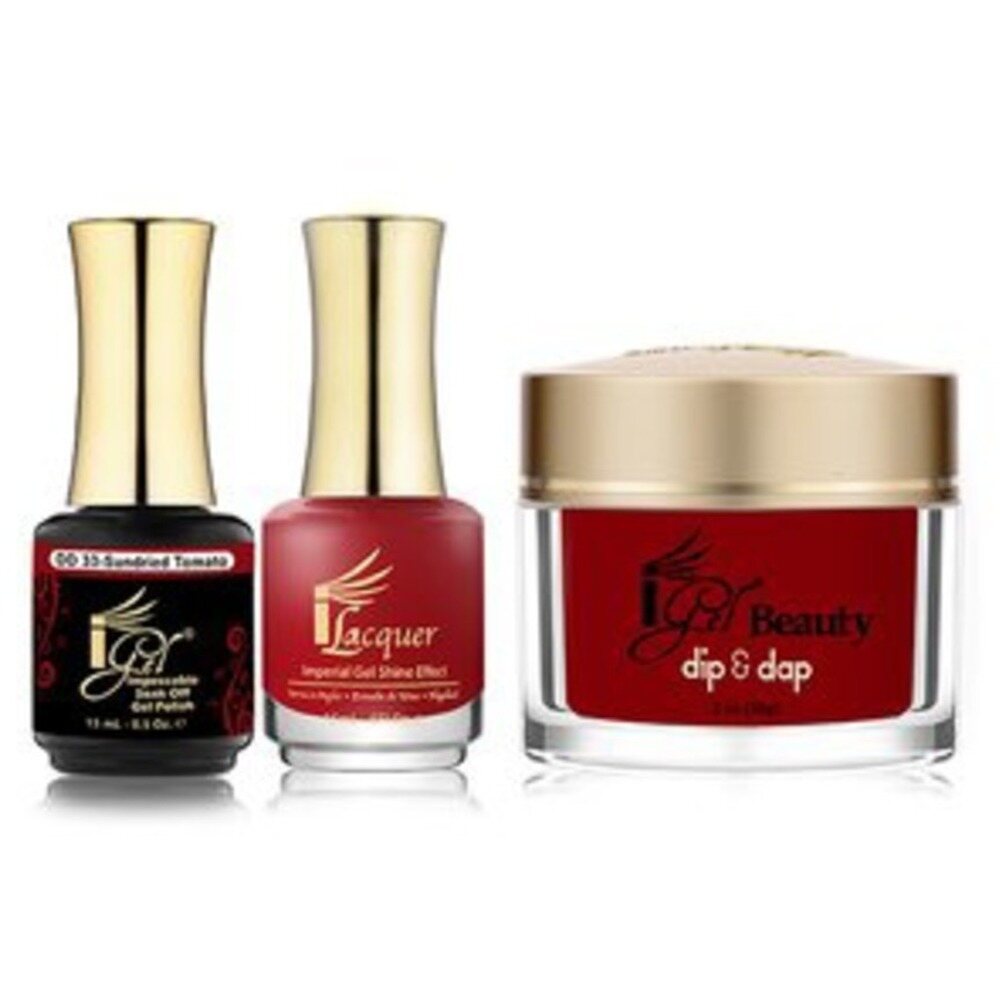 iGel 3-in-1 (GEL + LACQUER + DIP POWDER) - DD33 SUNDRIED TOMATO by iGel. iGel 3-in-1 (GEL + LACQUER + DIP POWDER) - DD33 SUNDRIED TOMATO. iGel Beauty's great 3-in-1 set includes 1 iGel Polish / 0.5 oz. + 1 iLacquer / 0.5 oz. + 1 Dip & Dap Powder / 2 oz. - all in matching colors.