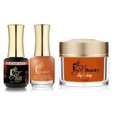 iGel 3-in-1 (GEL + LACQUER + DIP POWDER) - DD38 TEQUILA SUNRISE by iGel. iGel 3-in-1 (GEL + LACQUER + DIP POWDER) - DD38 TEQUILA SUNRISE. iGel Beauty's great 3-in-1 set includes 1 iGel Polish / 0.5 oz. + 1 iLacquer / 0.5 oz. + 1 Dip & Dap Powder / 2 oz. - all in matching colors.