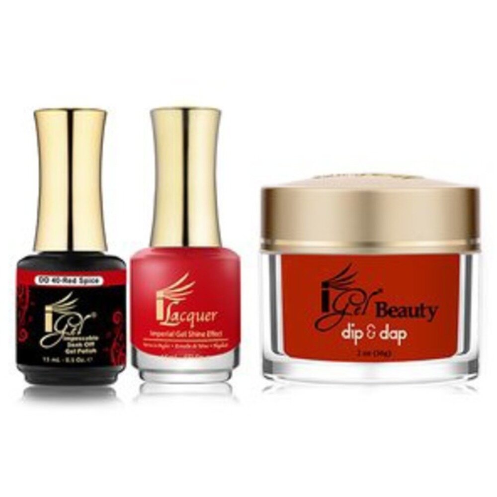 iGel 3-in-1 (GEL + LACQUER + DIP POWDER) - DD40 RED SPICE by iGel. iGel 3-in-1 (GEL + LACQUER + DIP POWDER) - DD40 RED SPICE. iGel Beauty's great 3-in-1 set includes 1 iGel Polish / 0.5 oz. + 1 iLacquer / 0.5 oz. + 1 Dip & Dap Powder / 2 oz. - all in matching colors.