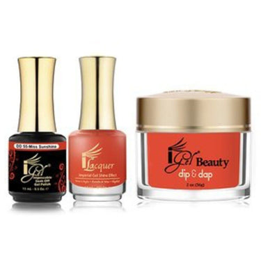 iGel 3-in-1 (GEL + LACQUER + DIP POWDER) - DD55 MISS SUNSHINE by iGel. iGel 3-in-1 (GEL + LACQUER + DIP POWDER) - DD55 MISS SUNSHINE. iGel Beauty's great 3-in-1 set includes 1 iGel Polish / 0.5 oz. + 1 iLacquer / 0.5 oz. + 1 Dip & Dap Powder / 2 oz. - all in matching colors.
