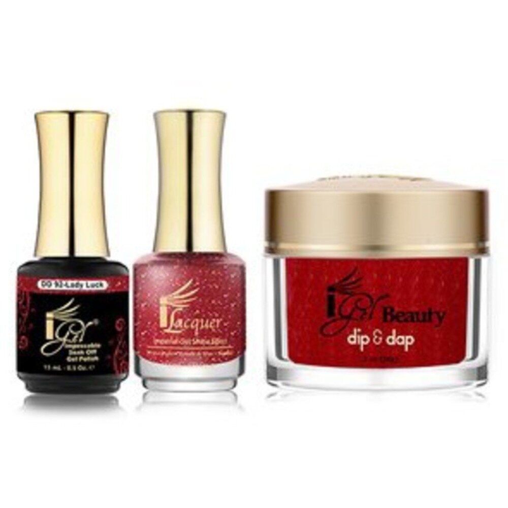 iGel 3-in-1 (GEL + LACQUER + DIP POWDER) - DD92 LADY LUCK by iGel. iGel 3-in-1 (GEL + LACQUER + DIP POWDER) - DD92 LADY LUCK. iGel Beauty's great 3-in-1 set includes 1 iGel Polish / 0.5 oz. + 1 iLacquer / 0.5 oz. + 1 Dip & Dap Powder / 2 oz. - all in matching colors.