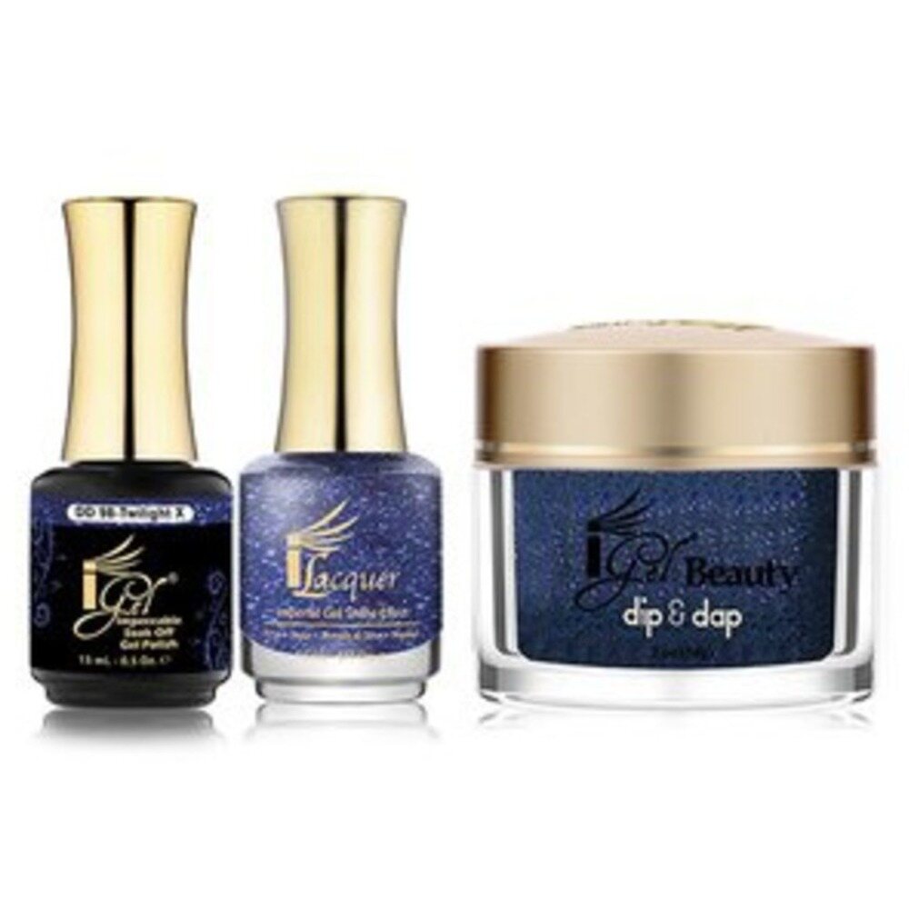 iGel 3-in-1 (GEL + LACQUER + DIP POWDER) - DD98 TWILIGHT X by iGel. iGel 3-in-1 (GEL + LACQUER + DIP POWDER) - DD98 TWILIGHT X. iGel Beauty's great 3-in-1 set includes 1 iGel Polish / 0.5 oz. + 1 iLacquer / 0.5 oz. + 1 Dip & Dap Powder / 2 oz. - all in matching colors.