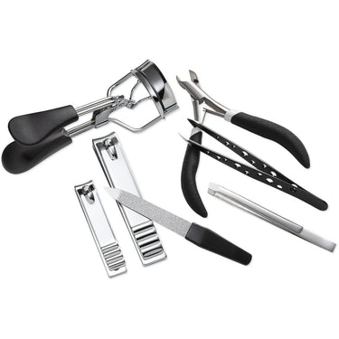 Implement Set / 8 Pieces. 8 piece set includes: 3-3/4" Sapphire Nail File, Non-slip Slant/Pointed tip Tweezer, Slant Tip Tweezer, 3-1/4" Toenail Clipper with file, 2-3/8" Nail Clipper, 4" Full Jaw Cuticle nipper with rubber grip handle, Eyelash Curler and a resealable plastic pouch with Velcro closure.