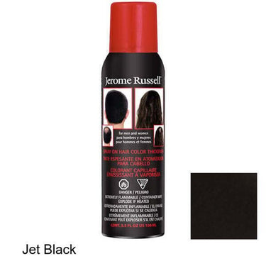 Jerome Russell Spray On Hair Color Thickener - JET BLACK / 3.5 oz. Jerome Russell's Spray-on Hair Color Thickener was created exclusively by David Jerome as the answer to thinning hair in both men and women. Hair Color Thickener when used as directed will effectively cover up light to medium bald spots. Remarkably effective also for fine and/or thinning hair as well as for touch up gray between colorings. Your hair will look fuller, and you'll feel as wonderful as you look!