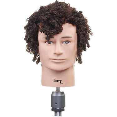 Jerry Male Manikin - 7"-9" Brown - Level 3 - 100% Curly/Coily Human Hair. The handsome Jerry Manikin has 7" - 9" long brown, Level 3, 100% human hair. Ideal for cutting and styling coily hair. Natural neck fits on a tripod or can be secured to any surface with a holder. Practice on curly/coily hair!