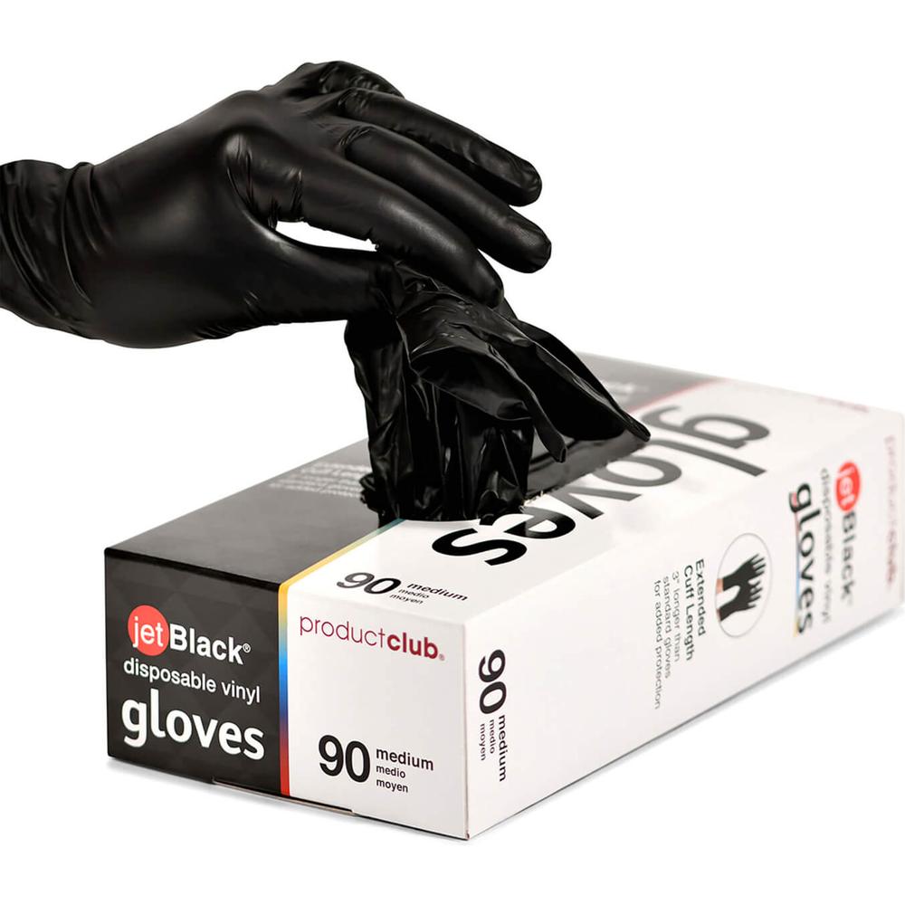 JetBlack® Disposable Vinyl Gloves - Extra Large / 90 Count. Specially-designed for the stylist who wants the perfect fit and a durable glove. Features a premium vinyl with a relaxed fit so hands move freely, and an extra-long cuff, extending 3" past the wrist, to protect clothing and jewelry. Latex-free and powder-free.