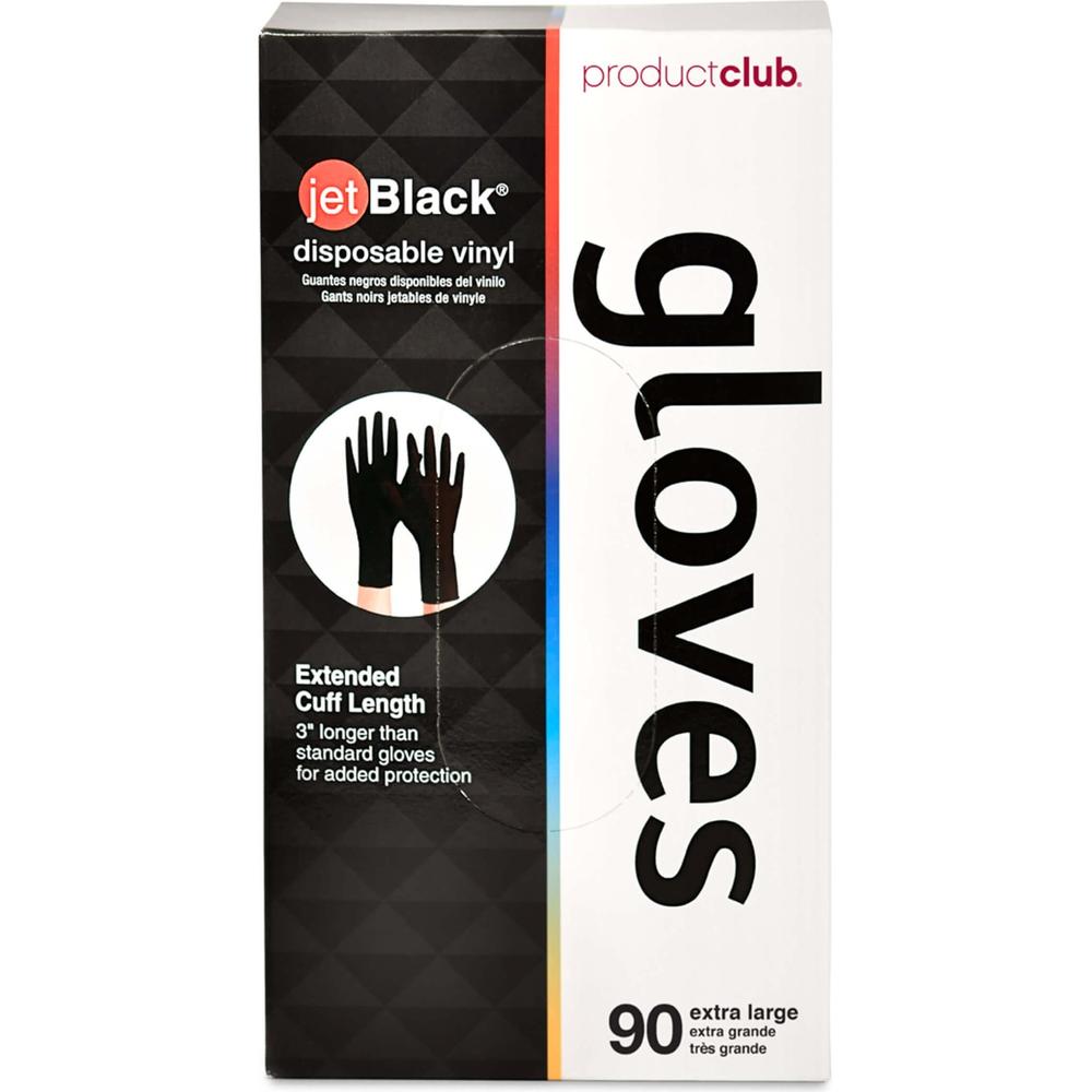 JetBlack® Disposable Vinyl Gloves - Large / 90 Count. Specially-designed for the stylist who wants the perfect fit and a durable glove. Features a premium vinyl with a relaxed fit so hands move freely, and an extra-long cuff, extending 3" past the wrist, to protect clothing and jewelry. Latex-free and powder-free.