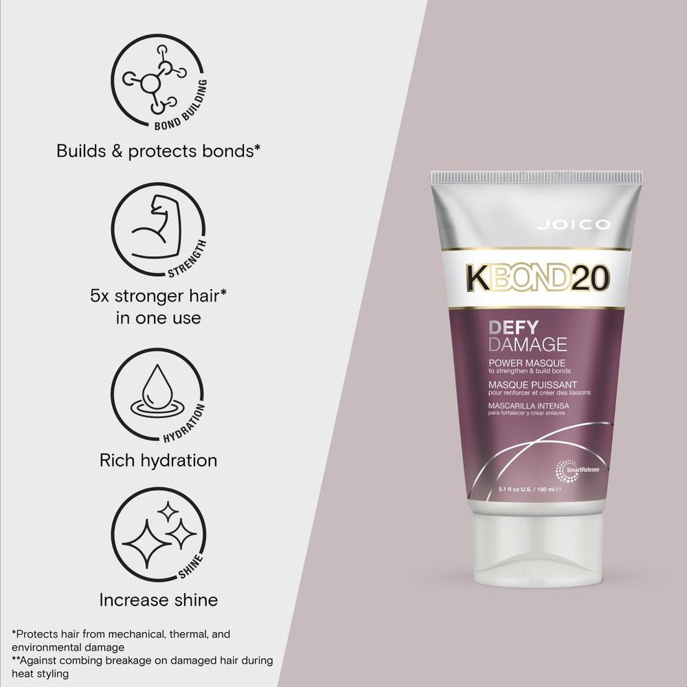 Joico Defy Damage KBOND20 Power Masque 5.1 oz. When it comes to professional results, salon clients expect their hair to be not just styled—but transformed. That's where Joico's Defy Damage KBOND20 Power Masque earns its place in your backbar. This potent, results-driven treatment delivers measurable strength, unmatched softness, and superior protection with every use. Designed with cutting-edge K-Pak keratin technology and powered by bond-building innovation, it’s the ideal solution for hair that’s suffered damage from heat styling, color processing, or environmental stressors.
