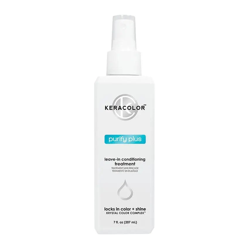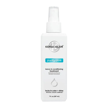 Keracolor Purify Plus - Leave In Conditioning Treatment / 7 oz. - 207 mL. PURIFY PLUS NEUTRALIZES CHLORINE & TRACE MINERALS. Chlorine and trace minerals steal hair's hydration, vibrancy, shine and softness. Infused with our Krystal Water Complex, our Purify Plus Leave-In Conditioning Treatment neutralizes everyday tap water and levels the playing field. Infused with Keratin to rebuild and strengthen your strands, Purify Plus Leave-In Conditioner miraculously puts the brakes on breakage and dulling damage. Safe for all hair types, it re-energizes, softens and brings back that shine, preserves precious hair color and vibrancy. And a delicate PH balance means cuticles are closed, leaving hair super smooth to the touch. It's everything desperate, damaged hair yearns for: neutralizer, protectant, treatment and sealer, in just a few precious drops.