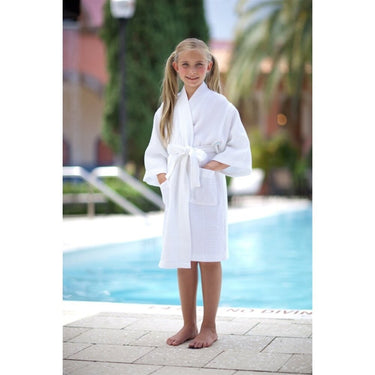 Kid's Kimono Waffle Robe / White - Ages 8-10 Years. Spas choose the lightweight waffle kimonos for their outstanding blend of comfort and performance. The robe's crisp, minimalist lines are ideal for moving around as well as relaxing by the poolside.
