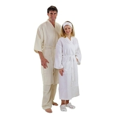 Kimono Style Waffle Weave Robe / White / Regular. When it comes to providing your clients with ultimate comfort and relaxation, the right robe can make all the difference. The Kimono Style Waffle Weave Robe in white is a perfect blend of soft cotton and durable polyester, designed to offer a luxurious, yet practical experience for your spa or salon guests. Whether your clients are enjoying a rejuvenating facial, soaking in the steam room, or just unwinding in your tranquil waiting area, this robe ensures they feel at ease while maintaining a polished and professional aesthetic in your facility.
