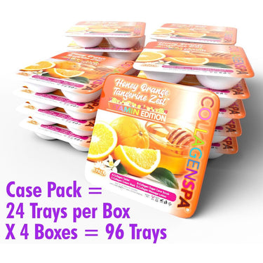 La Palm Collagen Spa 4 Step Pedi Tray - Honey Orange Tangerine Zest / Case Pack = 24 Trays per Box X 4 Boxes = 96 Trays by La Palm - Experience the luxurious softness of Collagen Spa in an easy to use 4-step tray. Introducing the luxurious Collagen Spa 4 Step Pedi Tray in the tantalizing scent of Honey Orange Tangerine Zest, designed exclusively for use by professional nail salons. Elevate your clients' pedicure experience to new heights with this comprehensive and indulgent foot care treatment.