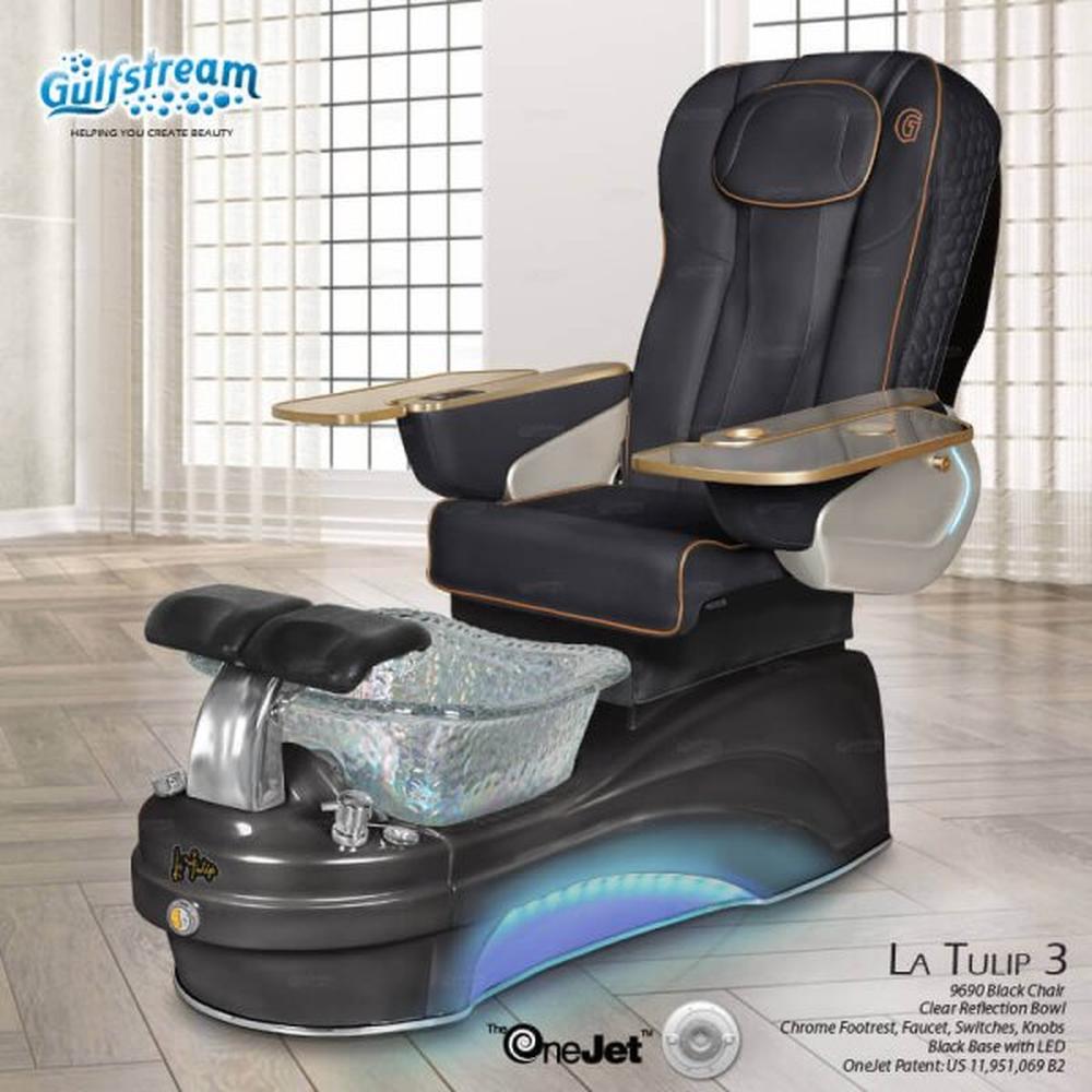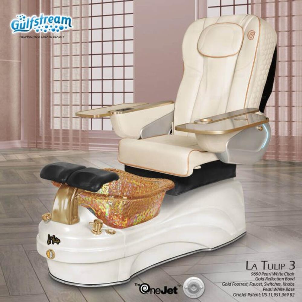 Welcome elegance and serenity to your spa or salon with the La Tulip 3 Pedicure Spa by Gulfstream. Designed to combine luxury and innovation, this pedicure spa features a sleek, illuminated base and a premium 9690 chair with elegant gold edging. Every detail has been crafted to deliver a rejuvenating and indulgent experience for clients while providing convenience and comfort for technicians.