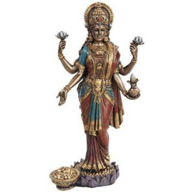 Lakshmi Statue / 10" Tall. A wonderfully detailed depiction of the goddess Lakshmi bearing many symbols of wealth and plenty. Cold cast resin. 10" x 5 1/4" x 3 1/4"