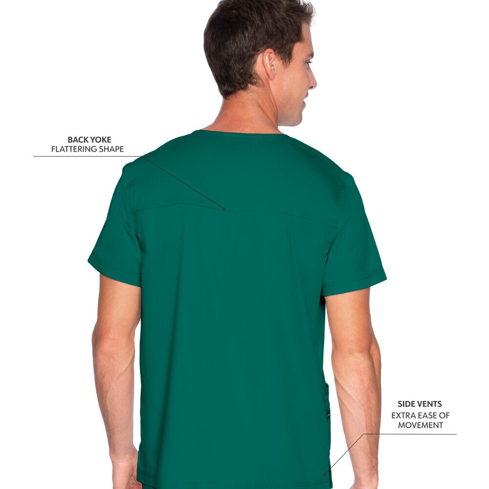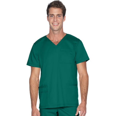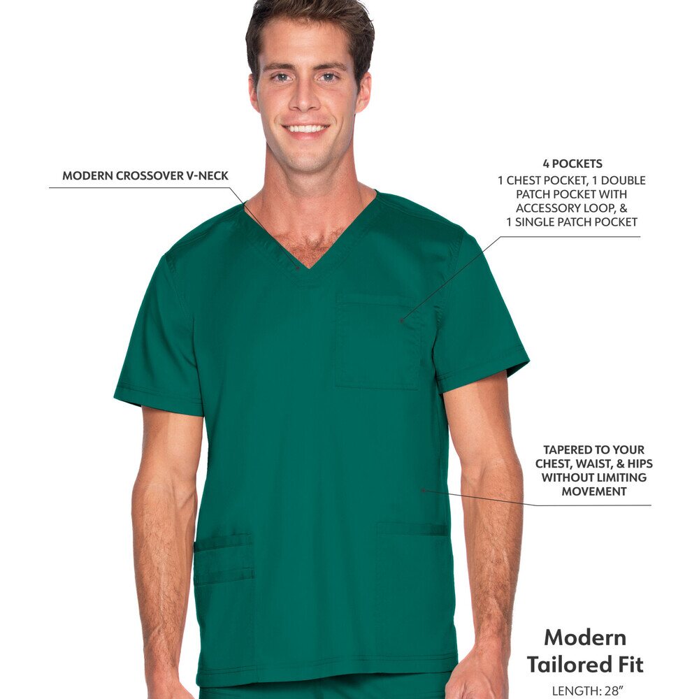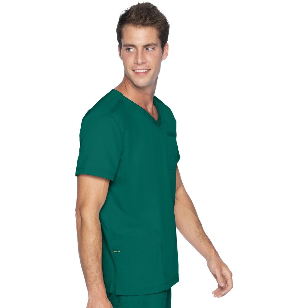 Landau Proflex Men's 4-Pocket V-Neck Top - HUNTER / Sizes S - 5XL. Landau's ProFlex crossover V-neck scrub shirt for men is stylish, comfortable, and functional. Back yoke detailing offers a flattering shape, side vents offer extra ease of movement, and four pockets provide plenty of storage space for your medical accessories. Landau's modern tailored fit is tapered to enhance your shape without constricting your movement, and Landau's 2-way comfort stretch helps give you added flexibility required of your work wear. Landau is known for producing scrubs that work as hard as you do! 73% Polyester/25% Rayon/2% Spandex